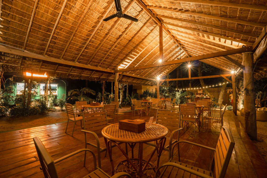 As the sky begins its evening transformation, our bar team shakes up refreshing sunset mojitos, pours chilled Thai artisan beers, and tropical sodas that pair effortlessly with the dishes. There is no rush here; guests settle into beanbags or gather at rustic tables as the trees overhead catch the last ribbons of light.
