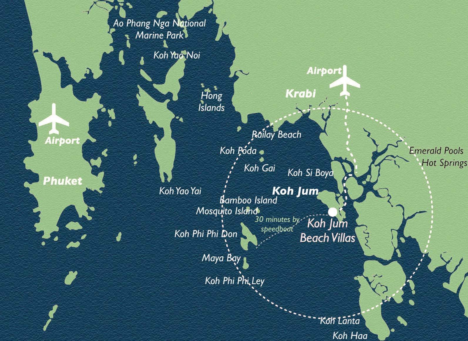 Koh Jum Beach Villas is located in Krabi on Koh Jum, facing the famous limestone National Marine Park of Phi Phi. The resort can be conveniently accessed from both Krabi Airport (KBV), and an airport transfer to the resort typically takes no longer than ninety minutes. We are also able to arrange airport transfers from Phuket or other islands in the area such as Koh Lanta or Phi Phi.