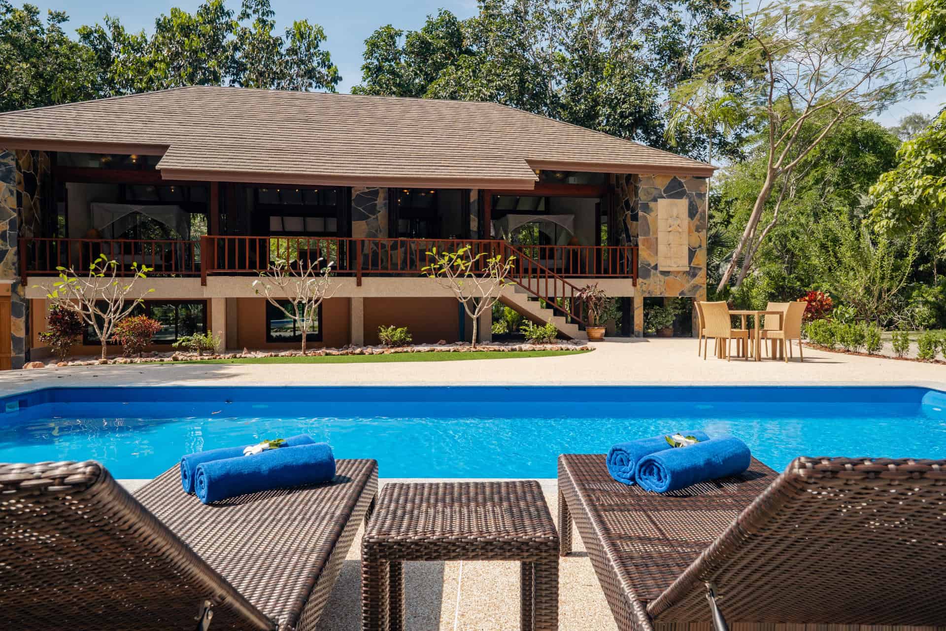 This villa features a detached master bedroom and a main building with full kitchen, dining, and lounge area as well as an attached en suite bedroom. Unique to the resort this villa also features a large hardwood sala, perfect for alfresco dining.