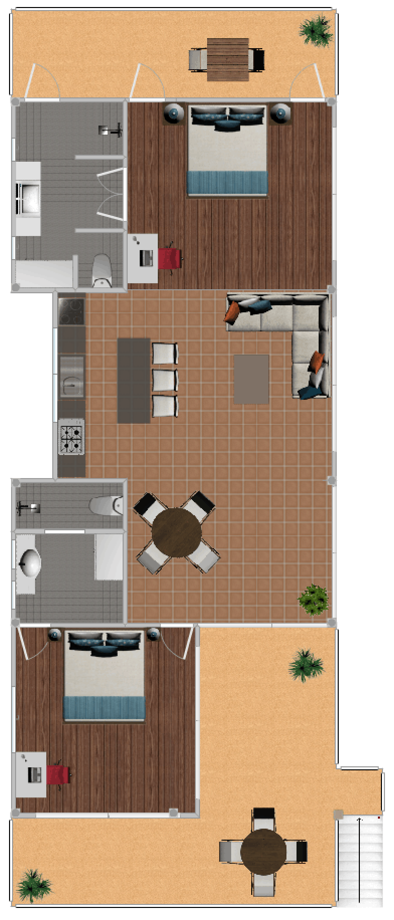 The open plan, split level studio design with separate private master suite offers affordable privacy.