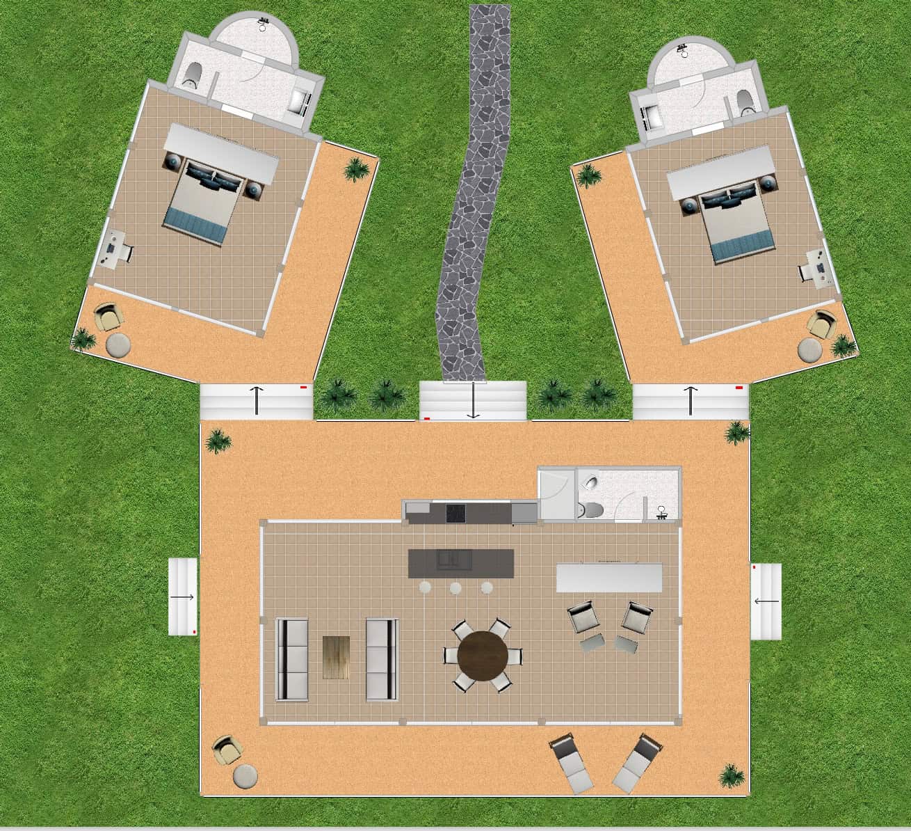 The two air conditioned master bedrooms are detached from the rest of the villa ensuring a high degree of privacy when desired, whilst the villa's design also allows communal dining or leisure time together. Each master bedroom has an ensuite bathroom with an open-air double balinese style rain-shower and a "his and her" vanity counter.
