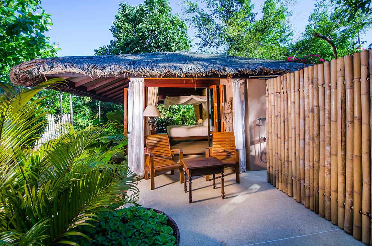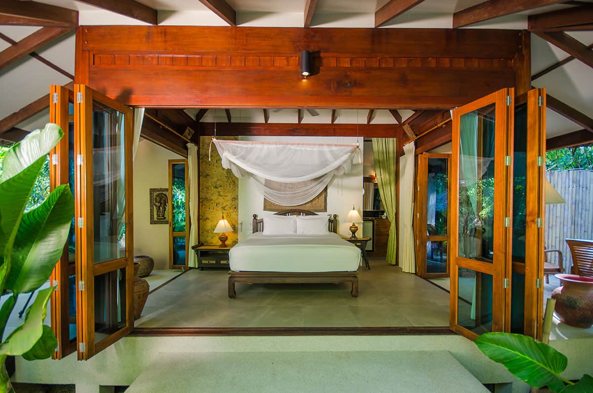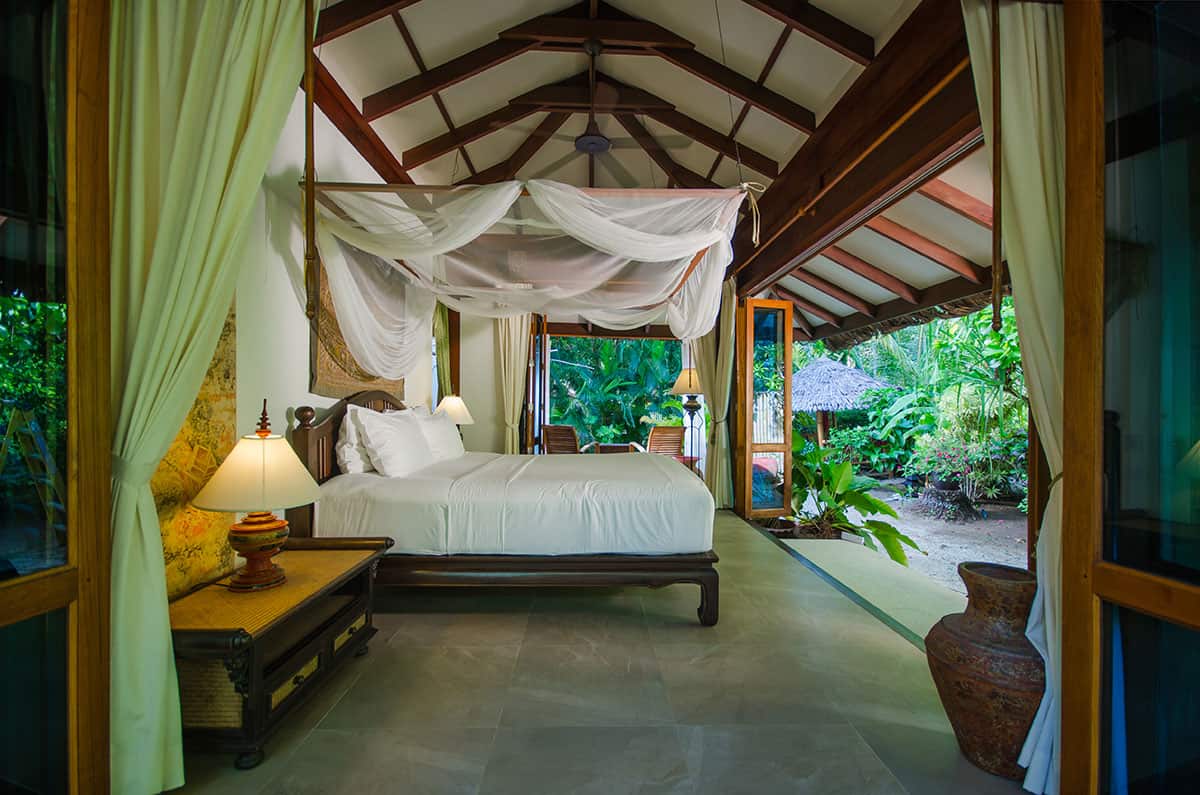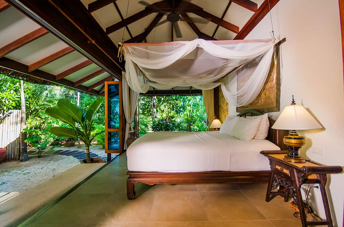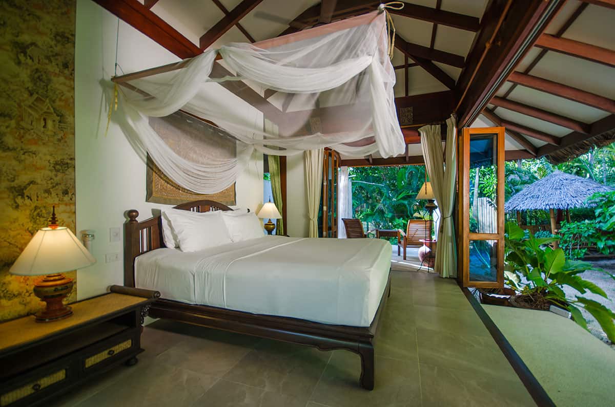 The suite is beautifully designed using lots of natural materials like wood and stone and intelligent architecture encourages plenty of natural ventilation throughout all areas which follows the eco concept of Koh Jum Beach Villas. Should it be a little too hot at night or if you prefer to sleep with the windows and doors closed then the air-conditioning is a welcome feature to have a good nights' rest. With its own private outdoor Balinese style shower, Lanna Art and romantic interior, large folding doors to your own lush garden setting, a cozy couples retreat awaits you.