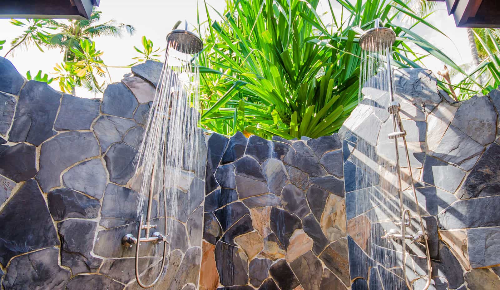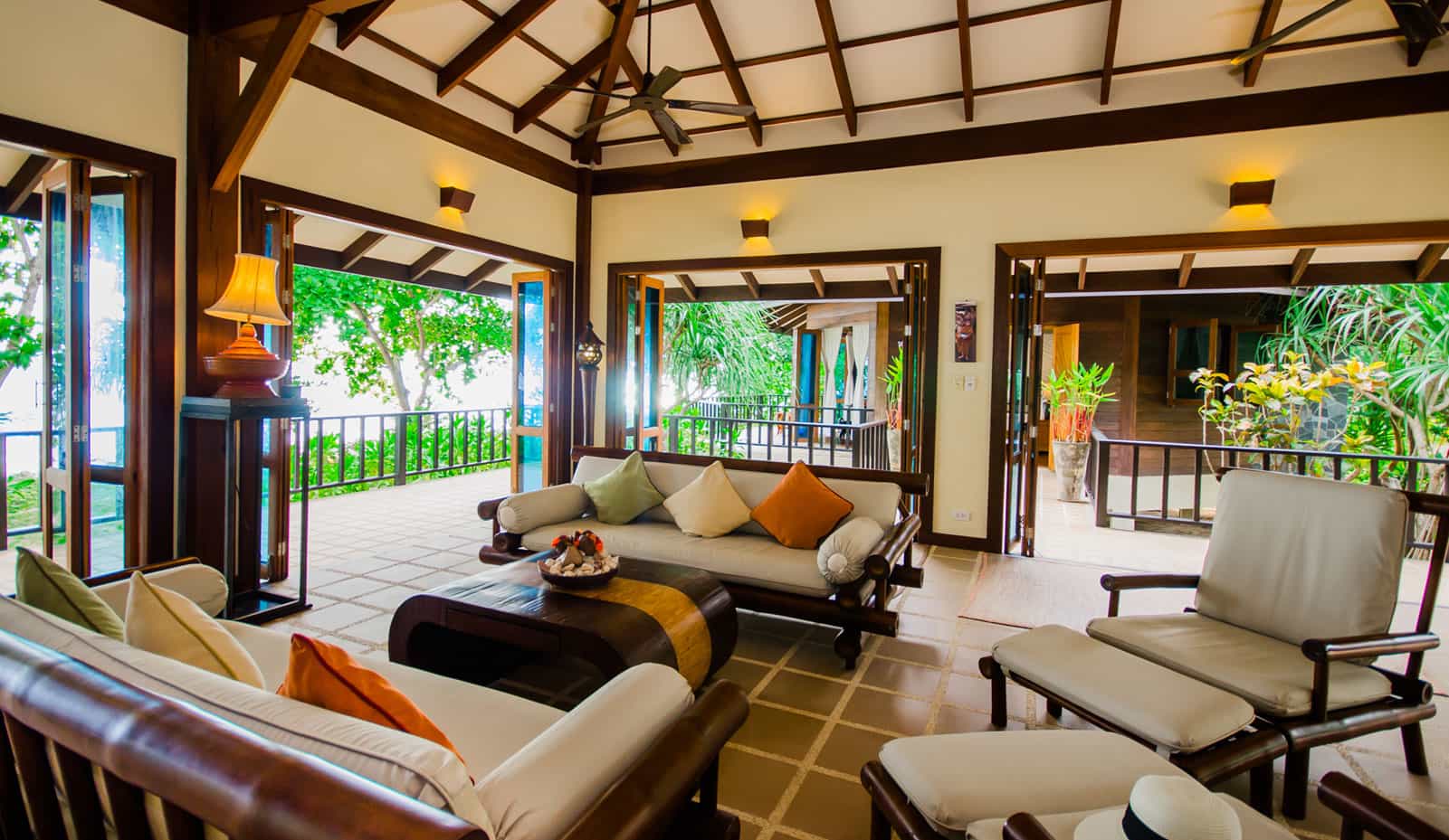 The villa has folding doors and windows allowing a nearly 180 degree view out to the private gardens, the private deck and the beach and ocean.