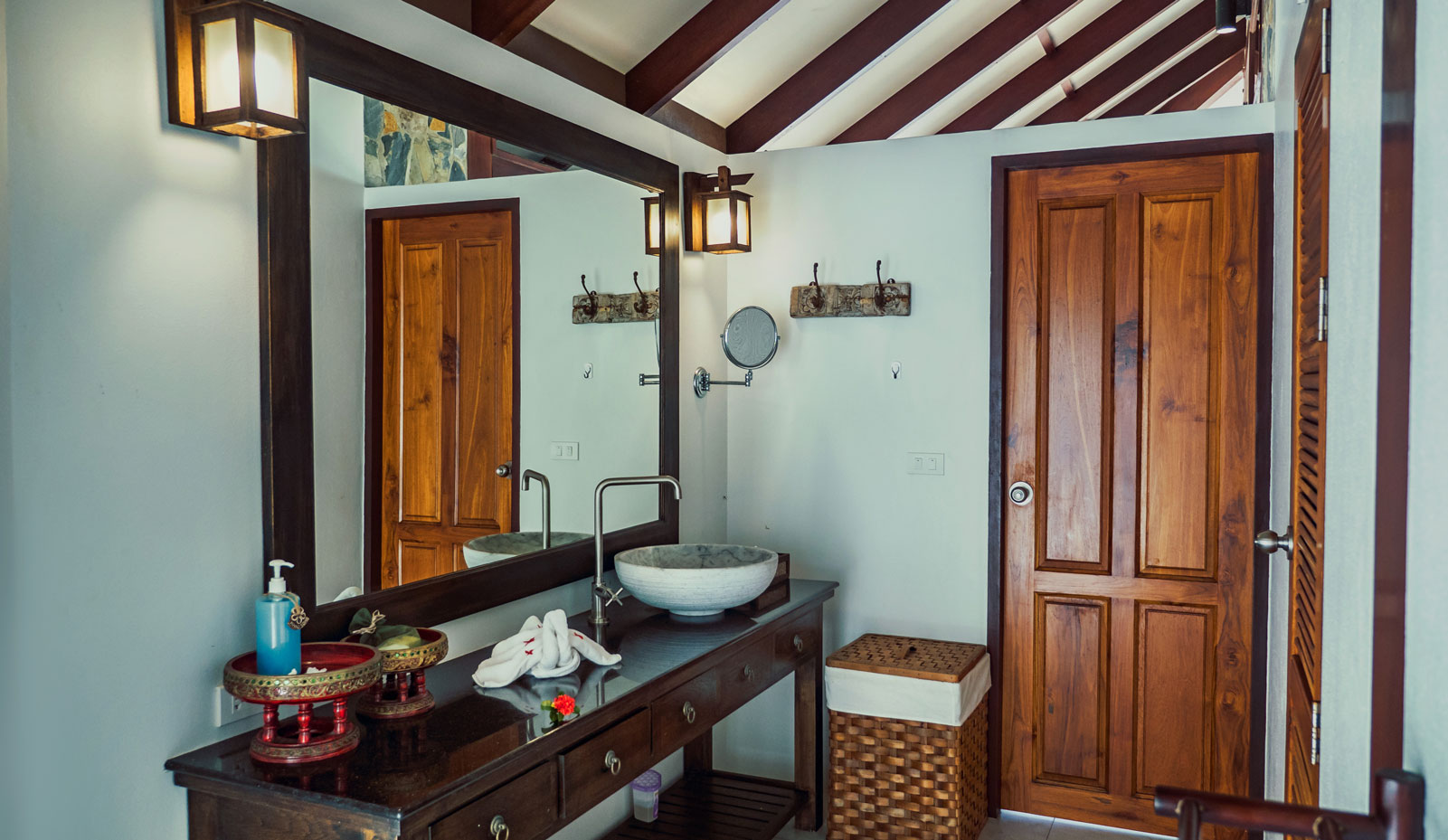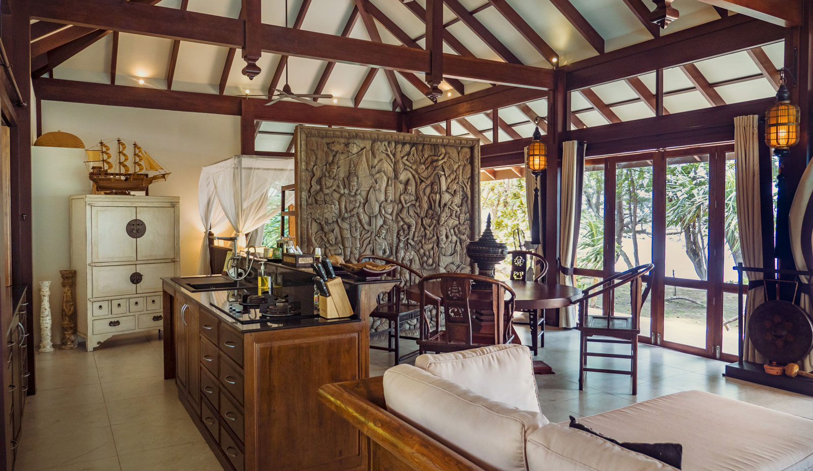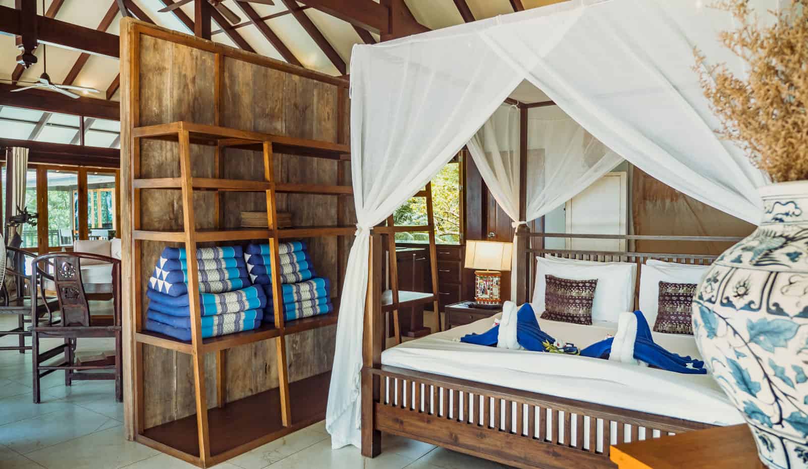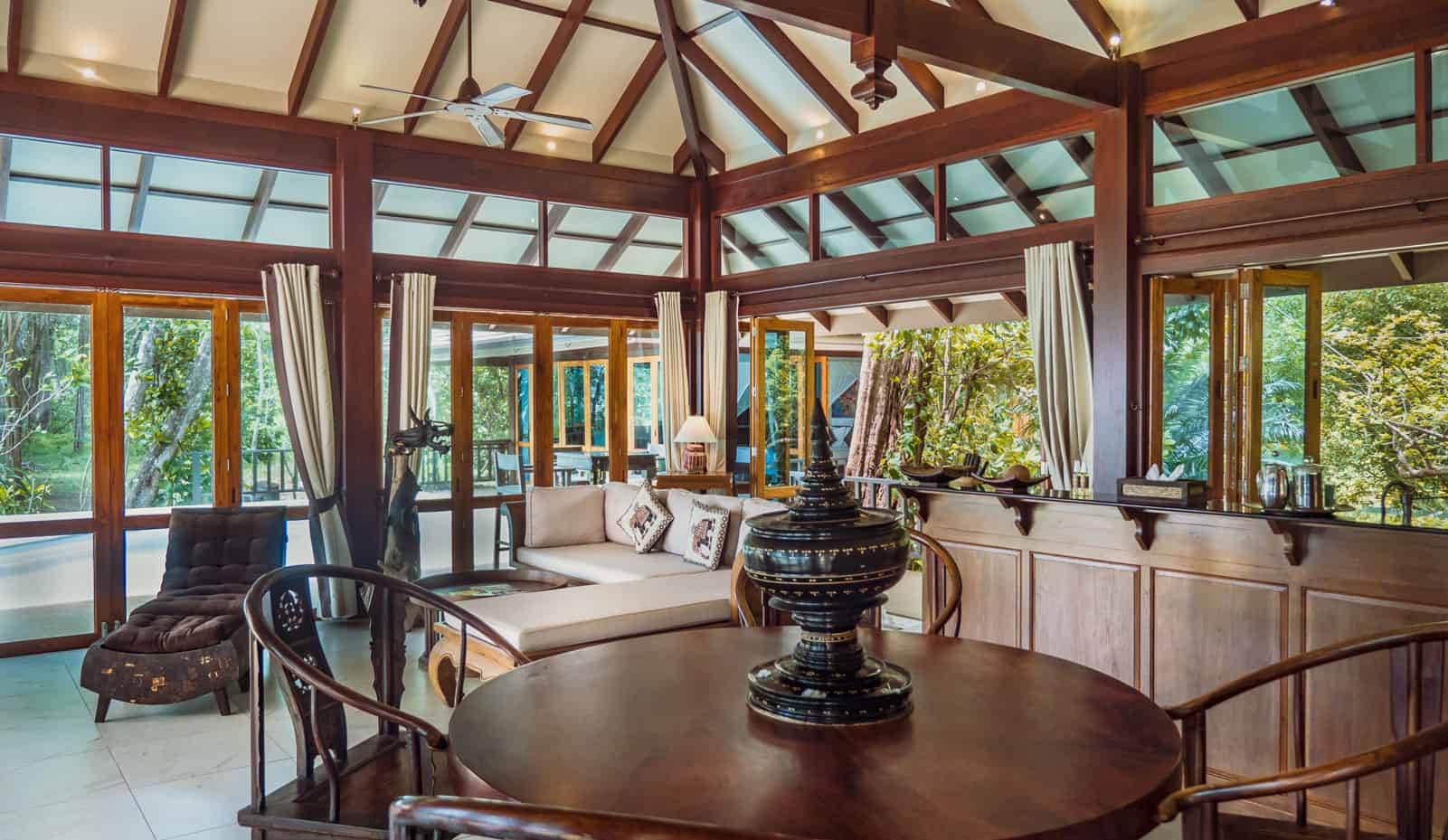 The villa is beautifully designed using lots of natural materials like wood and stone and intelligent architecture encourages plenty of natural ventilation throughout all areas of the villa which follows the eco concept of Koh Jum Beach Villas. When the large ceiling fans and natural breeze are not sufficient or if you do not like to sleep with the windows and doors open the air-conditioning will help cooling the bedroom spaces in the evening assuring you of a good nights rest.